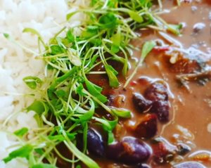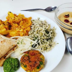 Das Menü: (alles vegan und ohne Soja) : saisonales Gemüse oder Bohnen Curry, Saisonale Chutney, Naan Fladenbrot, Cumin Reisgericht und Süsskartoffel-Mandelpudding als Dessert