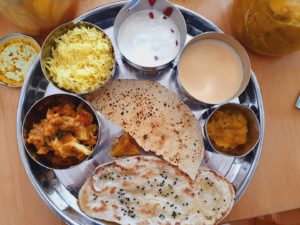 Das Menü: Gemüse-Pulao (mit Reis oder Hirse) Dal Dhokli (in gewürztem Dal gekochte Teigklöße/-streifen) Mango/Obst/Tomaten-Chutney oder Instant Pickles (je nach Saison und Verfügbarkeit) Tadka Raita (temperierter Joghurt) Kachumbar-Salat (gemischter Gewürzsalat)