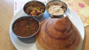 Das Menü: Rasam (gewürzte Brühe) Veggie Sambhar (gewürzte und würzige Linsen mit Gemüse der Saison), Rava uttapam (Grieß-Gemüse-Pfannkuchen), Instant-Quinoa-Dosa mit Kartoffel-Füllung, Kokosnuss-Erdnuss-Chutney, Zwiebel-Knoblauch-Kokosnuss-Chutney, Payasam-Dessert (kokosmilch Pudding, gekocht mit Ghee, Jaggery und Kokosnussmilch), *(Reguläres fermentiertes Dosa-Rezept auf Anfrage im Voraus, nicht im Preis enthalten)