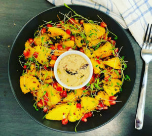 Das Menü: Koriander-Kreuzkümmel-Fenchel-Tee (dosha-ausgleichender Tee) Gemüse-Khichdi (ayurvedisches Rezept mit Reis, Mungbohnen, Gemüse und passenden Gewürzen, Süßkartoffel-Linsen-Grünkohlsalat (saisonal) oder Sprossensalat, khamang Kakdi Raita, Reis/süßkartoffel-Kokosnuss Pudding als Dessert, Pappadum